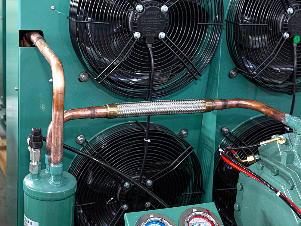 Конденсаторная установка открытого типа мощностью 15 л.с. имеет открытую конструкцию и подходит для небольших и средних коммерческих или промышленных холодильных систем. Оснащенный полностью закрытым компрессором, он обеспечивает стабильную циркуляцию хладагента и поддерживает обычные хладагенты, такие как R404A, R407C и R22. В конденсаторе с воздушным охлаждением используется медная трубка и алюминиевая ребристая теплообменная конструкция, обеспечивающая сильное рассеивание тепла. Устройство может быть оснащено защитными и вспомогательными компонентами, такими как регулятор давления, смотровое стекло для жидкости и фильтр-осушитель, для удовлетворения конкретных потребностей. Электрическая система соответствует универсальным стандартам безопасности и поддерживает трехфазное электроснабжение. Общая конструкция проста в установке и обслуживании, что делает ее гибкой для использования в холодильном терминальном оборудовании, таком как холодильные камеры и холодильные витрины.